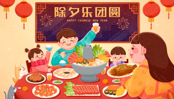 这是一款除夕一家人吃团圆饭矢量素材,桌子上有各种各样的美味菜肴,就连小猫小狗都围到桌子上来了,素材格式为 EPS,含 JPG 预览图。